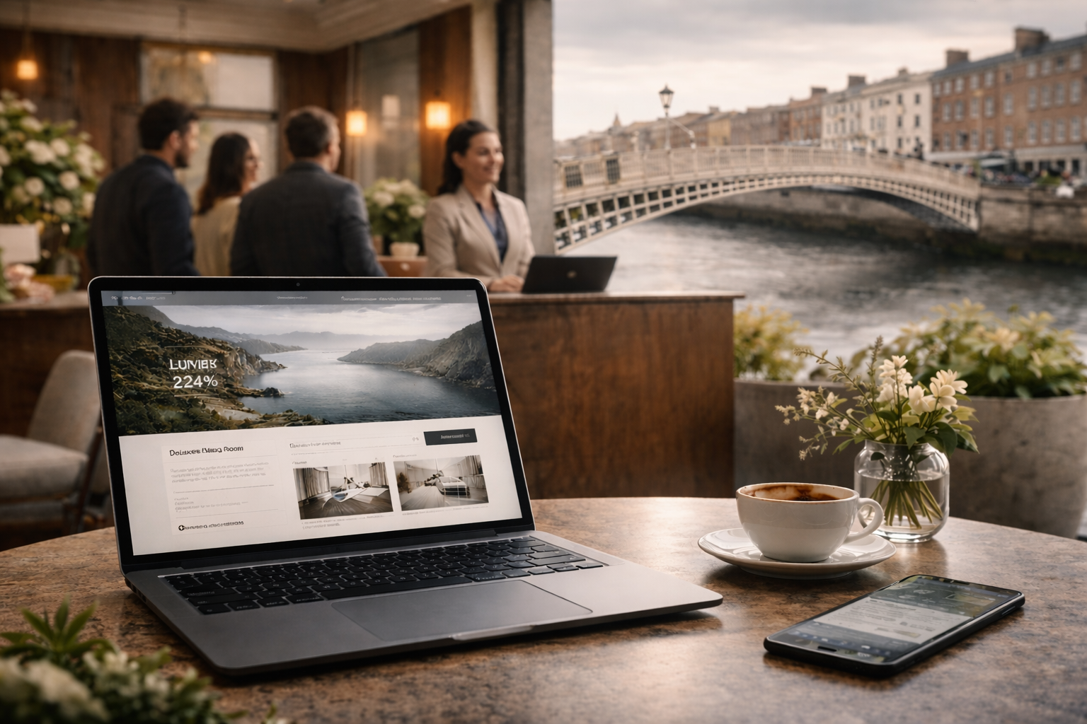 Luxury Irish hotel exterior at sunset with digital marketing report